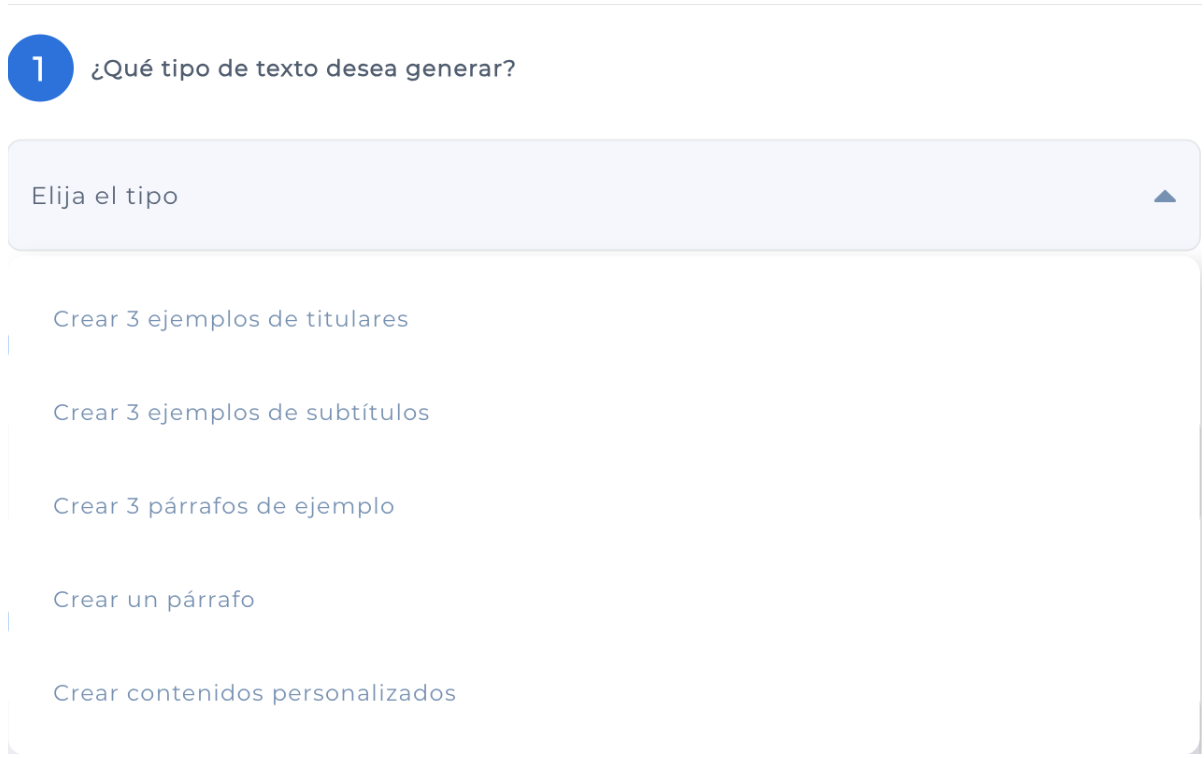 Selecciona una de las 5 opciones disponibles indicándole al asistente de redacción cuántos y qué tipo de texto quieres crear: sólo títulos, subtítulos, párrafos o un contenido con varios párrafos sobre un mismo tema.