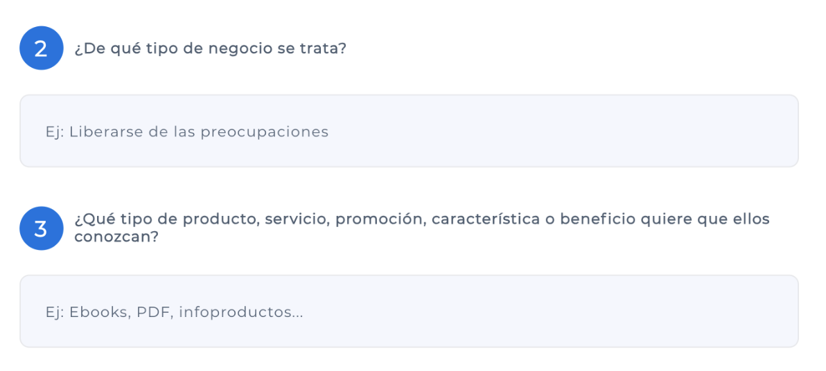 ¡Consejo! El asistente de redacción crea textos basados en palabras clave identificadas sobre tu negocio, por lo que no tienes que escribir textos largos en ninguno de los campos indicados, pero es esencial añadir las palabras exactas que definen tu negocio y el enfoque del texto que se creará. ¡Estas respuestas ayudarán a orientar la creación de contenidos de forma más específica y eficaz!