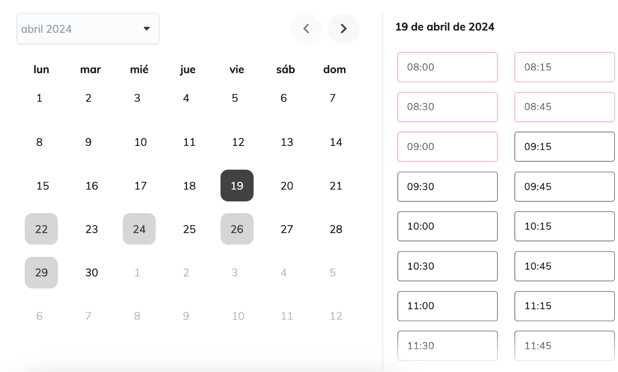 Horarios disponibles cada 15 minutos, pero con varios horarios bloqueados debido a una cita a las 8 de la mañana que durará 1 hora y 10 minutos.