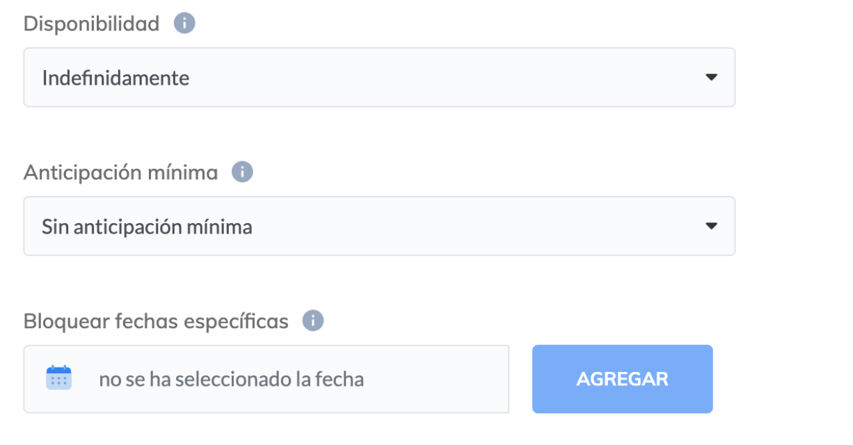 3. Disponibilidad: Comprueba si se han establecido límites de disponibilidad para fechas o días concretos del calendario. Esta opción afecta a la fecha hasta la cual las horas disponibles aparecerán en sus calendarios, bloqueando todas las demás después de la hora configurada.
