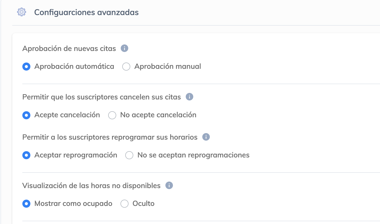 La configuración exacta de las horas de tu calendario es esencial para garantizar una experiencia de programación sin interferencias. Dependiendo de la configuración que elijas, las horas programadas pueden entrar en conflicto y bloquear nuevas reservas. Por lo tanto, es crucial revisar cuidadosamente toda la información en esta sección cuando notes que las horas que deberían estar libres están bloqueadas: